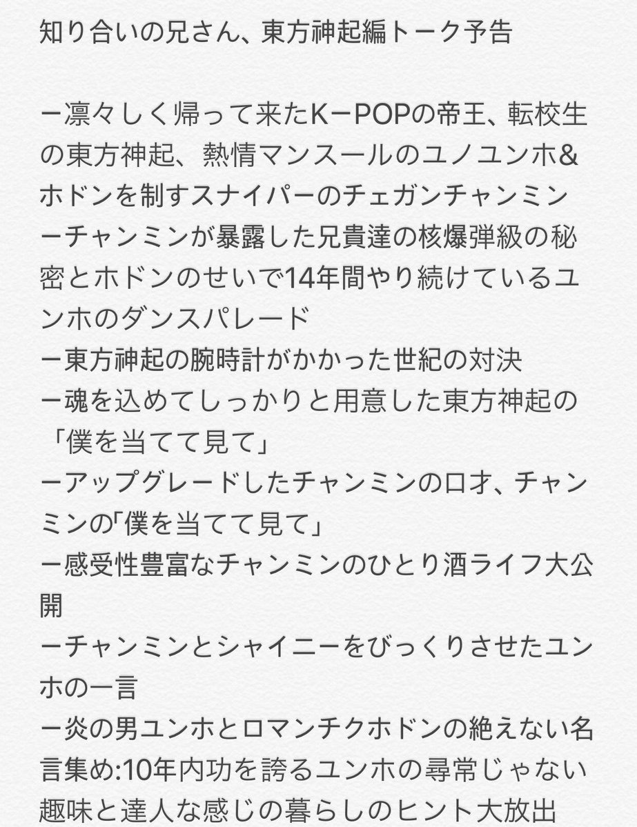 Y:本当に楽しみです!早くお会いしたいです。土曜8時50分ついに「兄貴学校」に僕達が転校しました。知り合いこ兄さん、東方神起編、本放死守お願いします