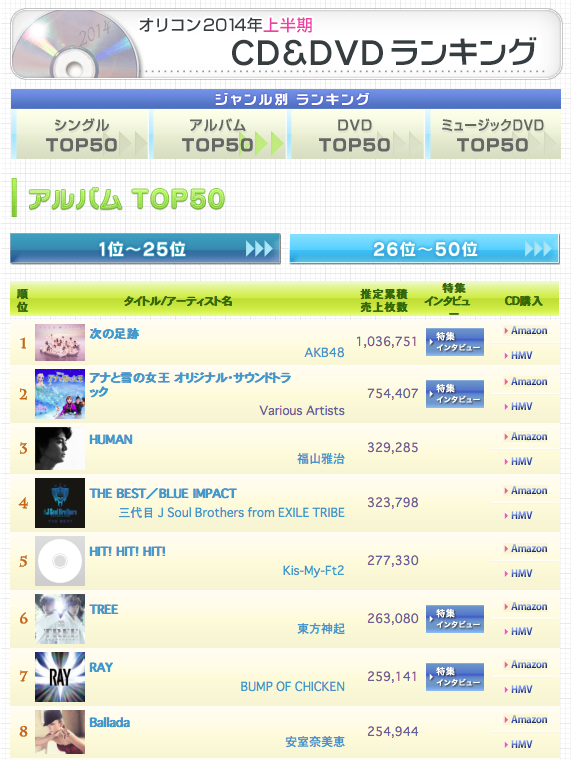 日本のアルバムチャートである「オリコン」が最近2014年上半期CDランキング」を発表した。集計期間は昨年12月23日から今年6月16日まで。約6か月分のデータだ。シングル、アルバム、DVDなどの分野別の売上合計をまとめた。