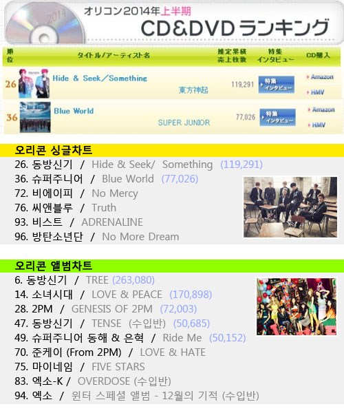 2014年上半期の韓流キングは '東方神起'であった。「オリコン」によると、東方神起は上半期Kポップシングルとアルバム部門1位を総なめにした。Kポップガールグループの中には「少女時代」が最高の成績を収めた。アルバムチャート2位を占めた。