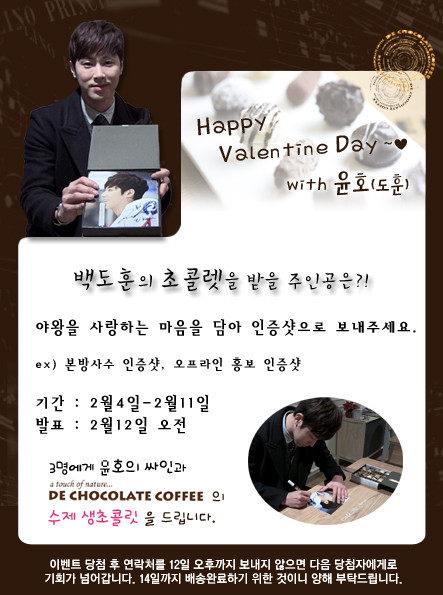 ②野王バレンタインデーユンホインタビュ訳:今回はバレンタインデーの記念に小さなプレゼントを用意しました。チョコレートです。皆様に僕達の愛情をたっぷり込めてお送りするのでご期待下さいね。→