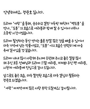 見守ってくださったファンの皆さん、視聴者の皆さんに真に感謝します。これからももっと頑張る様子や、発展する様子でもっと熱心に活動するチョン・ユンホになります。最後まで「野王」にたくさんの愛をお願いします。有難う御座います。(fin)