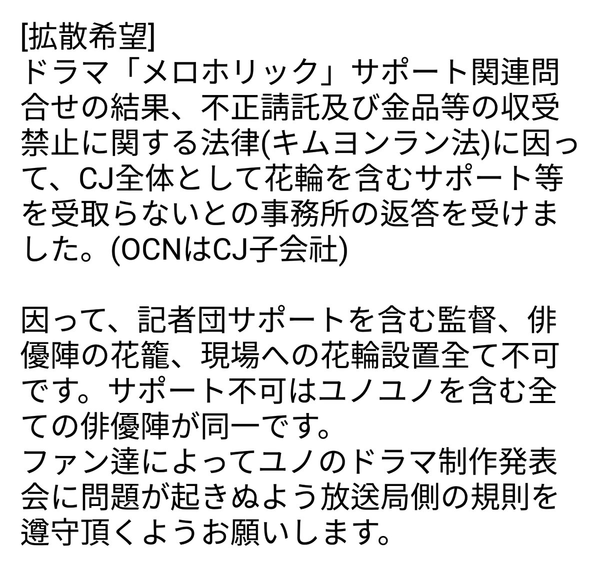 ドラマ「メロホリック」サポート関連問合せの結果、不正請託及び金品等の収受禁止に関する法律(キムヨンラン法)に因って、CJ全体として花輪を含むサポート等を受取らないとの事務所の返答を受けました。(OCNはCJ子会社)