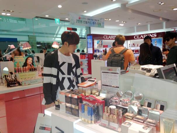 新羅免税店化粧品売り場で、高度の集中力を見せるユンホさん!やはり花のユンホと呼ばれるだけで出てきたのではないましたね。そのような姿をムフッに眺める遠くチャンミンさん!
