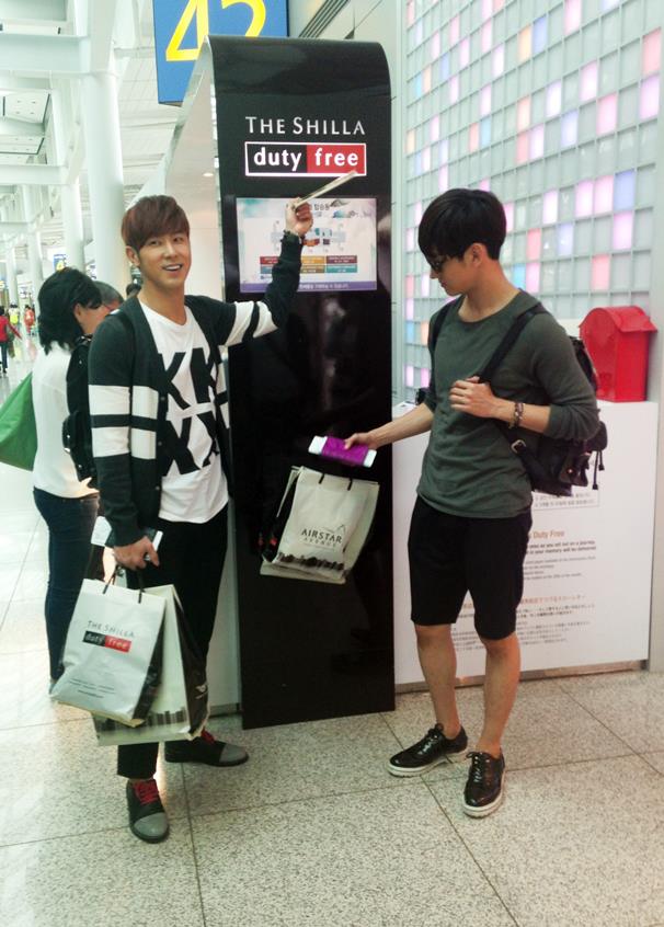 恥を冒して写真撮影をお願いしたところ、新羅免税店案内デスクの前で精一杯楽しいポーズを取ってくれたユンホさん!