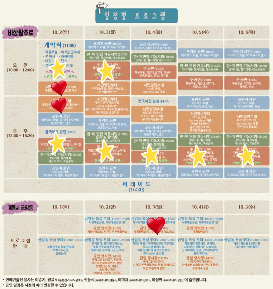 「芸能人出身勇士はイ・スンギ、ユンホ、シンドン、ウニョク、ソンミンが出演します」って書いていある!ってことは星マークつけた公演+ハートつけたダンスコンテストは出演だね。毎日出演だ!!