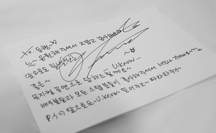 この日『ミュージカル-宮』の本格的な練習を激励するために練習室を訪問したファンは、各種食べ物と練習に必要な物品を準備して、制作スタッフ及び俳優に配った。ユンホ(ユノ)とランは、ファンたちが準備した各種食べ物が入った箱を持って、『ミュージカル-宮』の年下スタッフから俳優のまで、一人一人に配る配慮を見せて、同僚出演陣とスタッフを感動させた。
