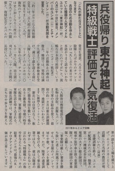 9月14日号の誌面に「兵役帰り東方神起、特級戦士評価で人気復活」と題した記事を掲載した。