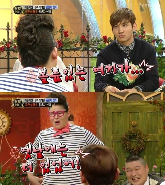 チャンミン、 "イ·ヨンジャのように"理想告白チャンミンが理想的にイ·ヨンジャを挙げた。去る5日放送されたKBS 2TV '月光プリンス"でイ·ヨンジャ、キム·ワンソン、キム·スク、グォンジンヨウンなどが出演して派手な話術を披露した。この日の放送では、章ジャックサンペの"顔赤くなる子供"にについてトークを進行した中でカン·ホドンがチャンミンに女性出演陣の中で誰理想に近いかと尋ねた。これチャンミンは最も理想に近い人で"イ·ヨンジャ"を挙げて"ボリュームのある女性がいい"と素直に告白して、笑いをかもし出した。するとイ·ヨンジャはチェガンチャンミンの理想と告白して歓呼して"昔はもっとボリュームあった"と冗談を言って皆を爆笑させた。一方この日放送では、勇敢な兄弟が自分のコンプレックスを素直に告白した。