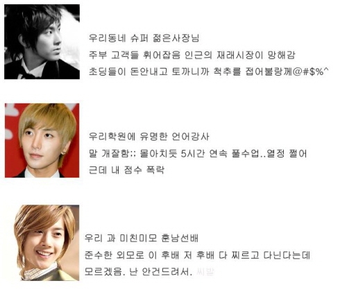 各アイドルグループのリーダーの写真とその外見に合った職業をマッチさせたもの。東方神起のユンホ(ユノ)は、主婦、お客様の心を揺さぶる町内スーパー若い社長に当選された。