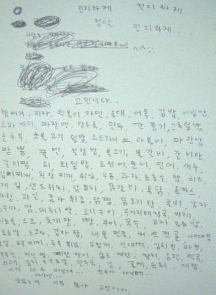 写真は東方神起メンバーチェガンチャンミンの悩みが書かれた文が含まれている。チャンミンはこのメモで"真剣に、真剣に、本 当に真剣に...悩みだ..."と始めた内容は、突然"ハンバーガー、ピザ、トッポキ、ラーメン、スンデ、かまぼこ、のり巻き、ビビンバ、スパゲティ、麺、酢豚、餃子、カンプンギ、唐辛子丼、絹ごし豆腐、牛焼肉丼、オムライス、ラボック、磁場ご飯、ちゃんぽん、チョルメン、焼肉、カルビチム、イカ、タコ、キムチ鍋、揚げ物、うどん、お菓子... "等食べ物の名前だけを一覧表示した。彼は最後に"これ近づいないのに...全部ではないが..."と書いた。そして最後に明らかにした悩みは、 "世の中には...おいしいのがあまりにも多くて悩んでいる..."だった。