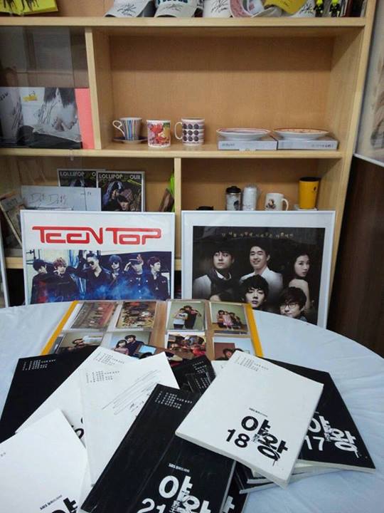 「野王台本&ユノ氏デザインビエンナーレマグカッププレゼント」&衣装、サイン展示について。及びビエンナーレ商品の販売について。初めてお店にいらっしゃいます方、この展示棚にビエンナーレ陶器類とサインが展示してございます。ユノ君の服も...