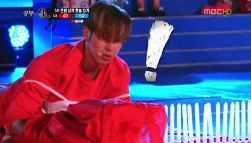 そして残りの1本をユンホが簡単に消して見せると思いきや、スカートでロウソクを覆ってしまうというミスをしてしまい失格に。また、2回目の挑戦でも47本を消したUVに対して、チャンミンが42本を消し残り5本を消せばよい状況で、ユンホはその5本を消せず、結局敗北。