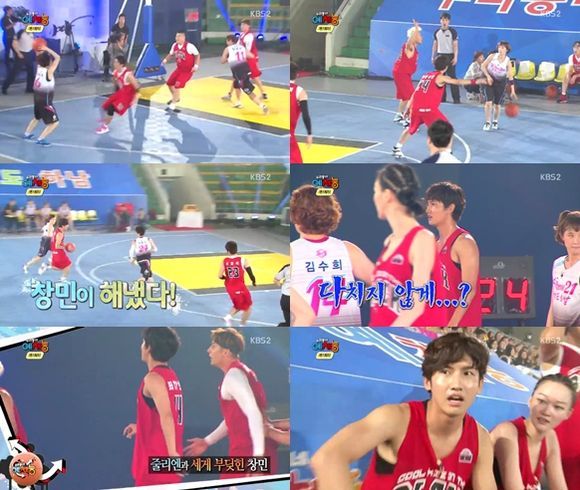 これイヒェゾングは"傷つかないように手を持って進んでください"と助言したが、その後チャンミンはリバウンドをするジュリアン川とぶつかって足首を負傷した。チャンミンは印象を書きながらも大丈夫だというサインを送って自分の怪我を心配しているメンバーを安心させた。