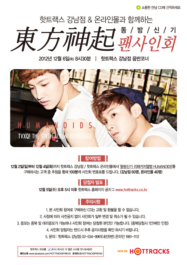 教保(キョボ)ハットゥレクス江南(カンナム)店&オンライン サイン会は12/2(日)から~ 12/4(火)まで党売り場の東方神起New Album ‘Catch Me’ Repackage [Humanoids]購買者中総100人を抽選して12/5 PM 17:00該当ホームページ(直行すること!)を通じて発表されます。