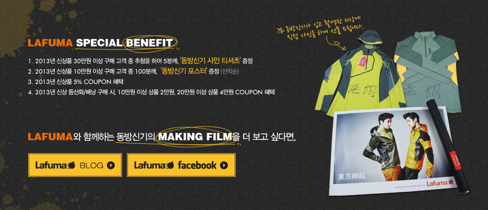 一方、LGファッションショップでは30万ウォン(26,000円)以上Lafumaの製品を購入した顧客の中から抽選で東方神起の直筆サイン入りの特別製作のTシャツおよびポスターを贈呈するイベントを共に実施する。
