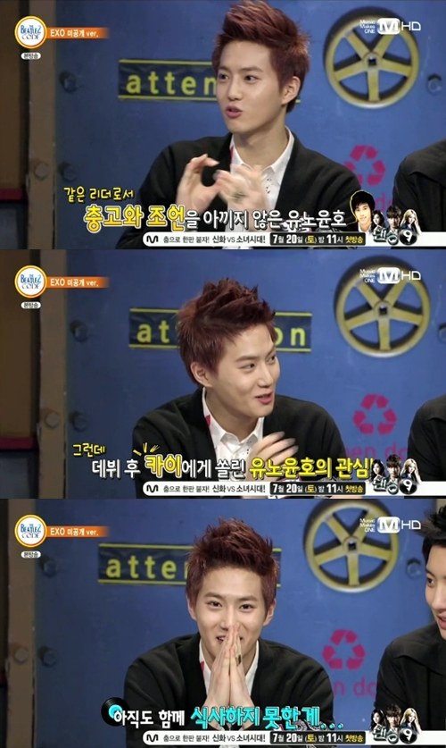 続いて、 "親しくなってから、エキソがデビューをすることになったが、デビュー後のユノ先輩がカイをもっともひいきだったよ。カイがメインダンサーなので、そのように見える残念な気がする。一緒にご飯食べることにしたが、まだご飯も食べられなかった"とさびしがった。これにMCは、SUHO "の心の中に隠しては、タイプのようだ"と言って笑いを誘った