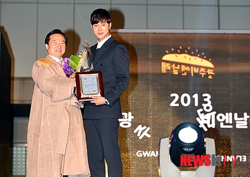 'ディック、モシギ"をテーマにした2013光州デザインビエンナーレが5日午後、光州北区光州ビエンナーレ館で華やかに開幕した中でユノが広報大使委嘱牌を受けて記念写真を撮っている。2013光州デザインビエンナーレは11月3日まで59日間、24カ国の600以上の作品を披露する。