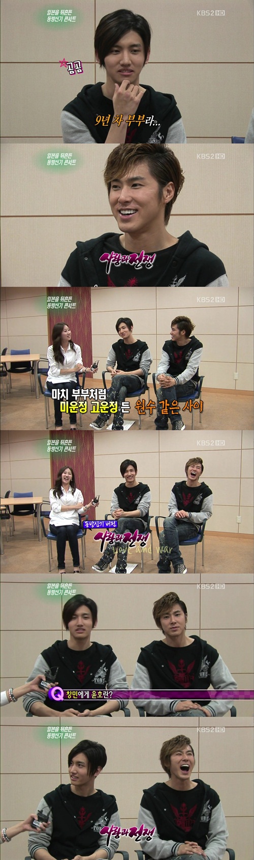 28日放送されたKBS2 '演芸家中継'では自身とユノ・ユンホの間を‘愛と戦争’と定義するチャンミンの姿が電波に乗って笑いをかもし出した。この日放送では東方神起の日本コンサート現場が電波に乗ったが、こちらで会ったチャンミンはデビュー10周年をむかえたという自身の話にリポーターが“9年目夫婦のようだ。”と笑い話をしようしばらく考えに陥った。