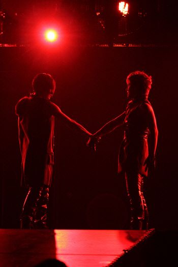 ▲ "東方神起ライブツアー2012トン"フィナーレ公演が4月21〜23日日本、大阪京セラドームで盛大に繰り広げられた。WHY舞台で手を取り合ったユノとチャンミン。