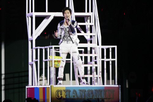 ▲ "東方神起ライブツアー2012トン"フィナーレ公演が4月21〜23日日本、大阪京セラドームで盛大に開かれた。移動舞台で歌うチャンミン。