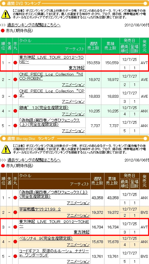 TONE DVDオリコンウィークリーチャート(一般DVD1位、Blu-ray 3位)ソース:@ ContinueTVXQ様