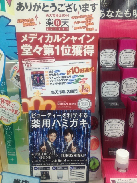 東方神起が広告高級歯磨き粉メディカルシャインの販売が好調のようです。楽天オンラインで10冠王、広告によると、2秒で3個ずつ売れたようです。東方神起がモデル商品が、高価にもかかわらず、良い販売成績を記録しているのを見るとなんだか胸がいっぱい^ _ ^