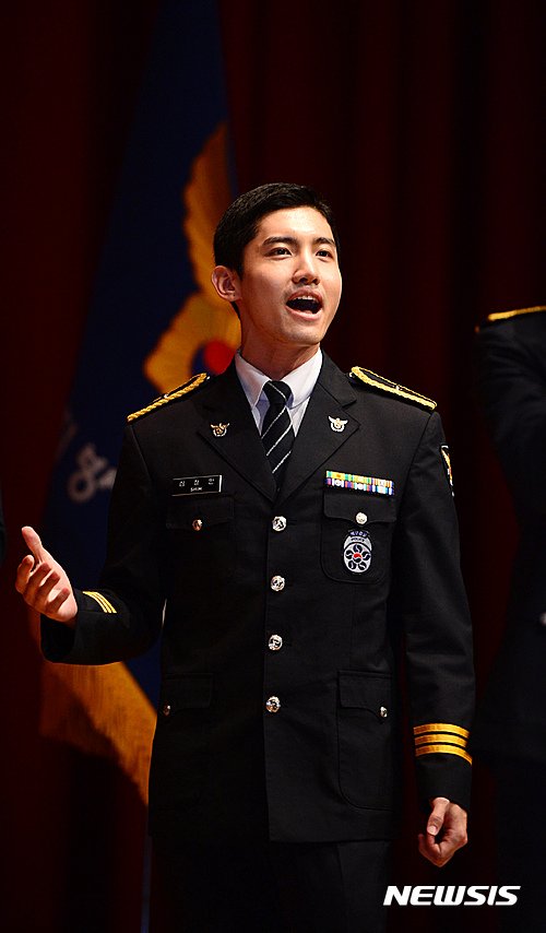 「警察広報団に服務中の東方神起のメンバーチェガン・チャンミンが23日午前ソウル鍾路区ソウル地方警察庁大講堂で開かれた第31代李相元ソウル地方警察庁長離任式で惜別歌として'その日を覚えながら'を熱唱している。」