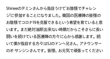 また、テミンは「このコメントを見られたすべての方、あたたかい気持ちで今回のおかげさまでチャレンジに参加してください #おかげさまでキャンペーン #おかげさまでチャレンジ #医療スタッフのおかげさまで」と、付け加えました。