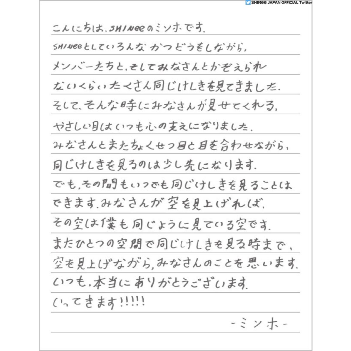 チャンミンもこの日の午後、自身のInstagramに写真を1枚を上げながら「時間は君の味方じゃないかもしれないよ、ミンホ…… 行ってきた人は知っている…… #さようならミンホ #忠誠 #元気に行ってこい」という文章を投稿した。