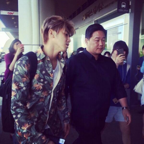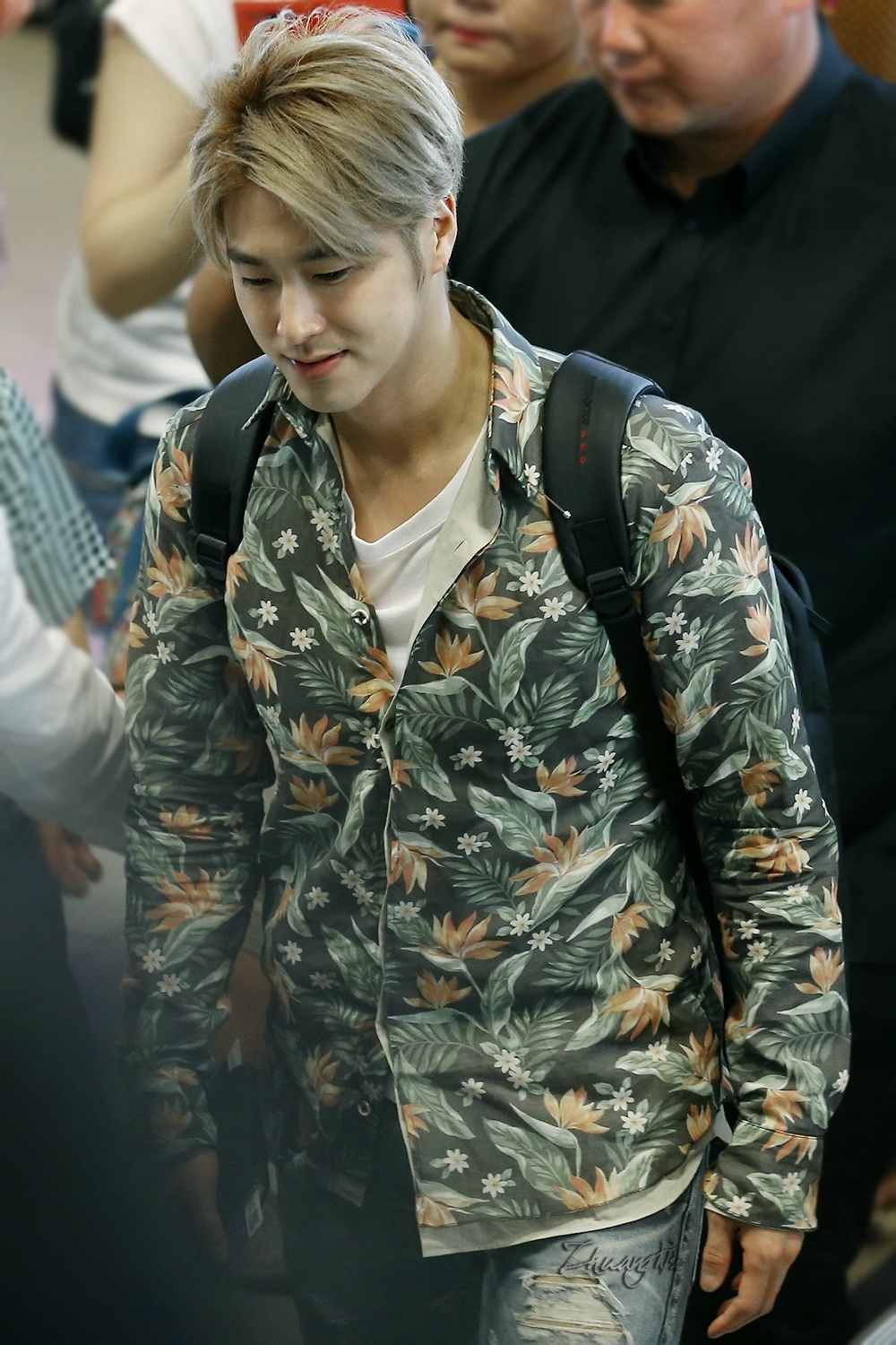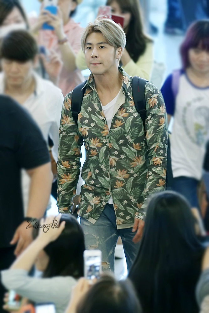 この日東方神起ユノを見守るために数多くの国内外ファンたちが大挙殺到し、注目を集め。また、東方神起ユノ·ユンホはフラワープリントドゥガ引き立って見えたシャツを着て破れたジーンズをマッチした。ここにスニーカーと黄色に染めた髪で空港ファッションを完成させた。