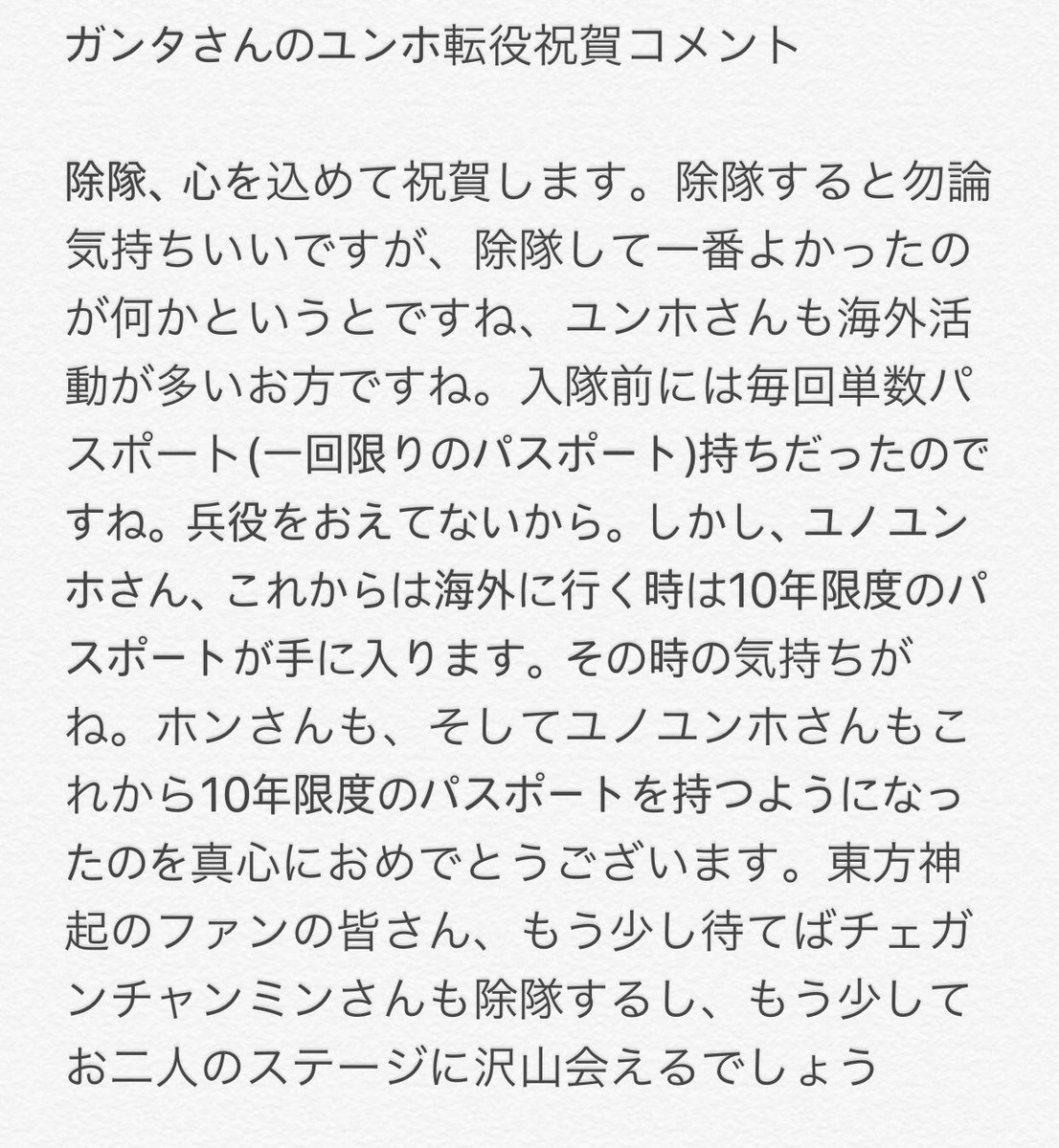 ガンタさんがDJを務めるラジオ番組でのユンホの転役祝賀コメント訳