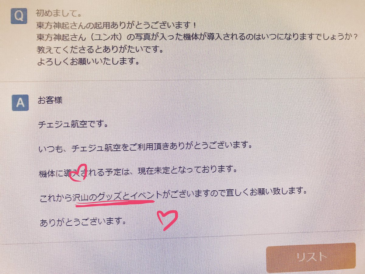 チェジュ航空に東方神起グッズやイベントを問い合わせた方のツイより