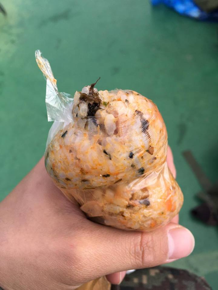 訓練の時、実戦の様にすると食器持ち歩く事はできないとし、ご飯とおかずとマヨネーズたっぷり混ぜて使い捨てビニール袋に入れて団結したいわゆる『暇おにぎり』