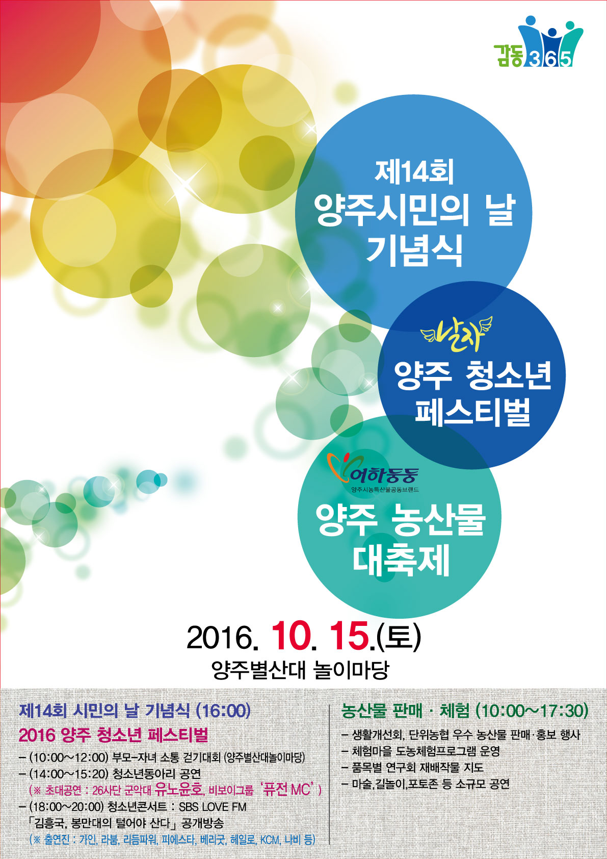 - 2016洋酒(楊州)青少年フェスティバル(10:00~20:00):青少年サークル公演およびSBS LOVE FM公開放送(アイドル グループおよびユノ・ユンホ初代公演など)