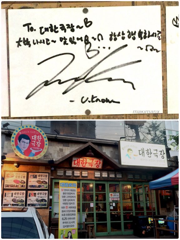 ユノのサインがある焼肉屋「テハングクチャン(대한극장)清潭店に行きました。ユノユノメニューは불꽃숙성등심(花火熟成ロース)とお弁当セット(飯ごうの辛いラーメン、お弁当箱のご飯ソーセージ目玉焼)。ファイヤー大迫力!お肉美味しいです♡