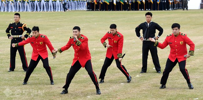 建軍68周年国軍の日記念式最終リハーサルが29日忠南(チュンナム)、鶏龍市(ケリョンシ)、鶏龍(ケリョン)大テヨン兵長で開かれてユノ・ユンホ、シンドンなど芸能人出身兵士たちが軍歌メドレーを歌っている。