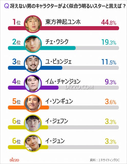 冴えない男のキャラクターが似合うスター1位には東方神起 のユンホが選ばれた。ユンホは以前、ドラマで冴えない男の役を演じ、見事にそのキャラクターを消化して注目を集めた。続いて2位に入った俳優チェ・ウシク も過去にドラマで、生まれてから一度も彼女がいたことがなく、人生の野望もない男を演じ、話題を呼んだ。そのほかユ・ビョンジェ、イム・チャンジョン、イ・ソンギュン 、イ・ジェフン、イ・ジュン らが上位にランクインした。