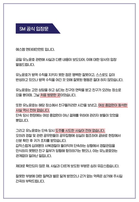 【直訳】#東方神起 ユンホに関する報道に対して、所属事務所「SMエンターテイメント」が発表した公式立場の全文。