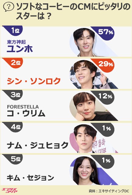 東方神起のメンバー、ユンホが「ソフトなコーヒーのCMにピッタリのスター」1位に選ばれた。