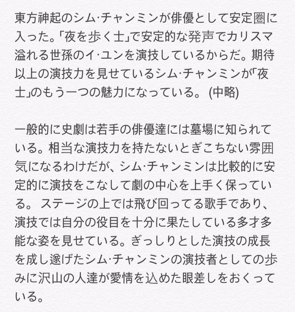 一方、チャンミンは『夜を歩く士』で演技力を認められた。元々歌手だから演技力については常に評価されたり指摘されやすい。チャンミンは今回、難しい史劇を自然に演じていると評価されている。チャンミンはイユンという皇太子役でイ・ジュンギと一緒に女性視聴者の心を掴んでいる。