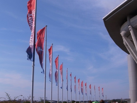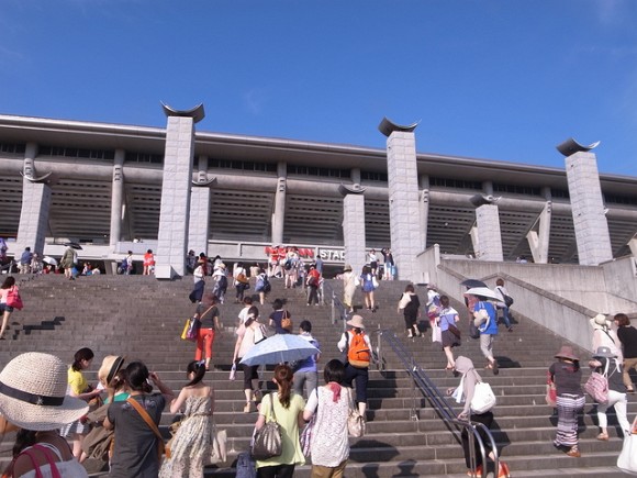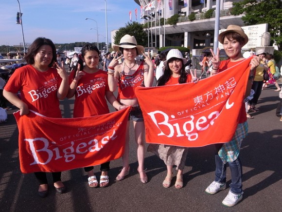真夏日とはいえ会場の外では誇らしげに「TOHOSHINKI」のフラッグが風にはためく、気持ちのいい天気に恵まれた8月17日、18日。夕刻の白い月が浮かぶ日産スタジアムに、ファンクラブ、ビギストの真っ赤なタオルを羽織ったファンたちが、続々と集まってくる。