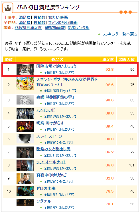 毎週、新作映画の公開初日に、ぴあ出口調査隊が映画館前でアンケートを実施して独自に集計し ているランキングです。