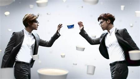 新CMは、ユンホさん・チャンミンさんが、抽象空間に浮んだ数多くのアイスクリームカップの中から、新鮮な生乳にこだわって生まれたアイスクリームを探し歩いていると、「牧場しぼり」にたどり着くという設定。