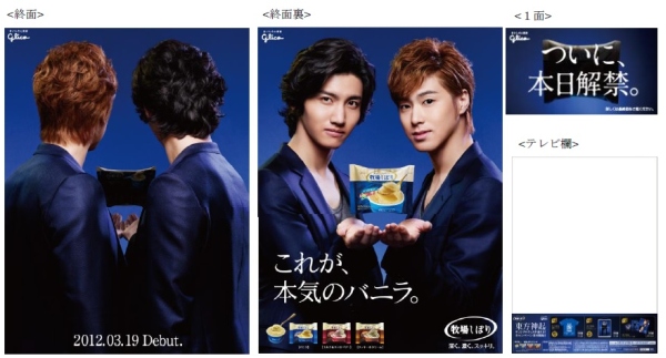 1つ目は、昨年も実施して新聞社に予約の問い合わせが入るなど反響の大きかった、新聞ジャック。3月18日の産経新聞・東京朝刊の終面から3面を、東方神起がジャックする。