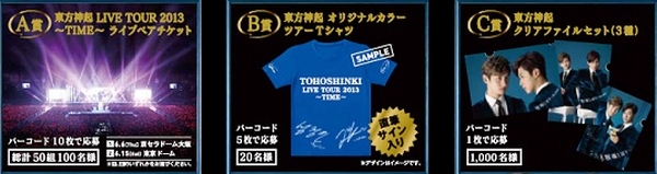 3つ目は、牧場しぼり限定の東方神起オリジナルグッズが当たるキャンペーン。牧場しぼりを購入してバーコードを送ると、抽選でオリジナルグッズが当たる。賞品は、4月からはじまる「5大ドームツアー!東方神起 LIVE TOUR 2013 ~ TIME ~」のライブペアチケットや、本人直筆のサイン入り T シャツ、クリアファイルセットなど。