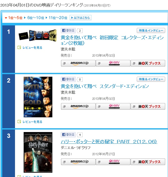 『黄金を抱いて翔べ』DVDオリコン1位・2位!