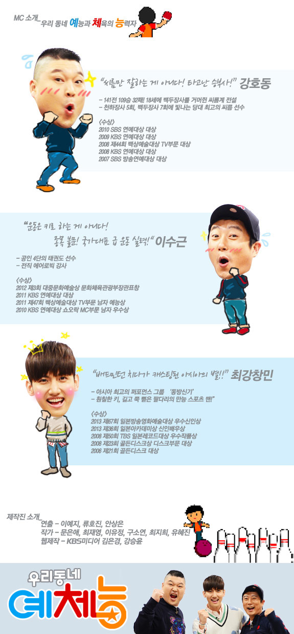 'うちの町内芸 "の制作陣は、"特に、イ·ビョンジンはパーフェクトの記録を持っている特別なボーリングの実力で芸術·体育のチームはすでに "先生"と呼ばれている。卓球に続き、ボーリングまた、視聴者の皆さんにエキサイティングな対決をプレゼントする予定 "とし、 "まだボウリング初心者に過ぎないカン·ホドン、チャンミンは、これらの三人と会ってどの程度のボーリングスキルを向上させることができるかも視聴ポイントになるだろう"と伝えた。