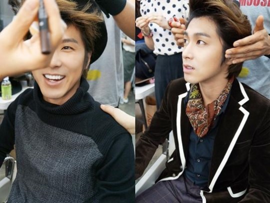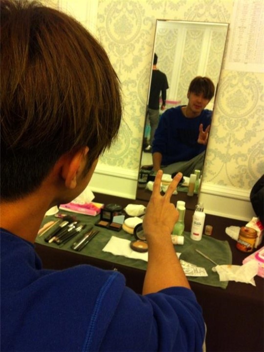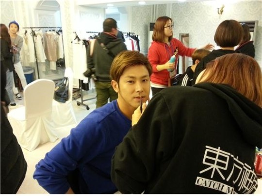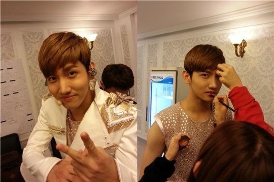 ユンホ兄に続き、私も舞台化粧しているんですよ。左の写真は、舞台上がる直前、マイク着用する時間五〜それでも緊張する表情は隠すことができませんね。^ ^; 右の写真は、コンサートの映像が出てくる中こっそり控室で急いで汗を吹いてメイクを修正している写真です。時間に合わせて上がってはスタッフの方との呼吸が重要です。カメラレンズを眺める目つき、生きてる〜