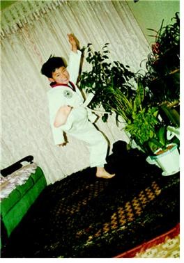 私が幼い頃から運動をした、初めて学んだ運動がテコンドーだった。テコンドー有段者である父に沿ってテコンドーを学びたいとせがまれて初めて道着を着てキックの場面です。本当に運動はまだ始まっていた時期だったと思います。白帯が少し恥ずかしい子供の頃の私に大きな思い出を抱かせたんです^ ^