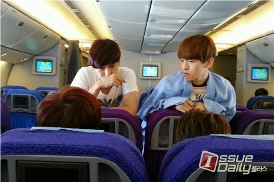 今回は、 EXO 弟たちを見に席を移しました。 やはりチャーター機を自由に移動できていいですね。〜 色々な話をする途中撮られたカット! 何か真剣な話していたようですね。 私のそばにいる可愛い表情のメンバーは、 EXO-K ペクヒョンです。